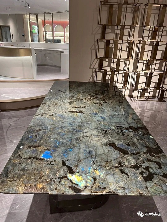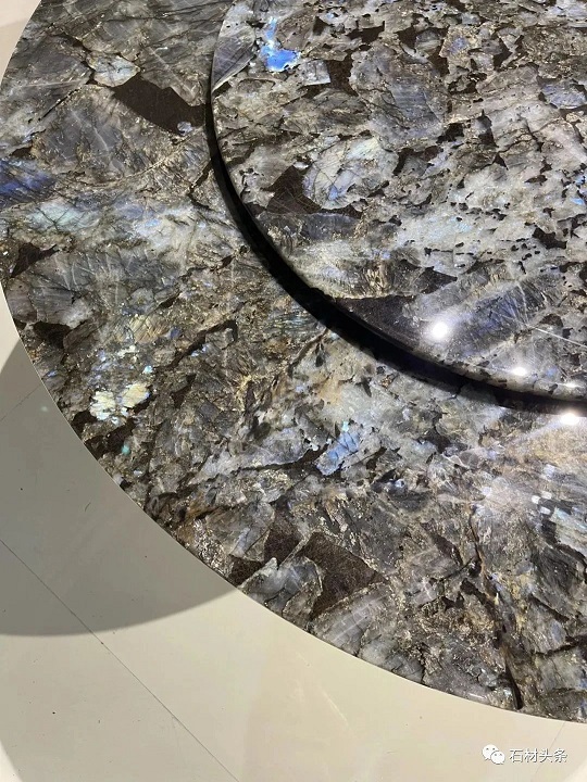 产自非洲,来自拉布拉多半宝石的源材料,黑色的云母与宝石的共生体,他的蓝宝石在餐桌上的光彩七彩斑斓,夺人眼球。